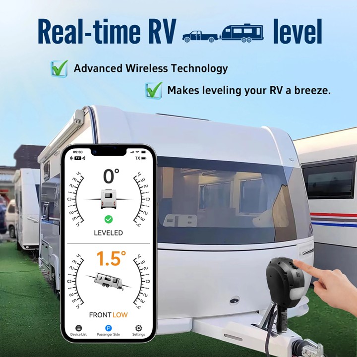 Náklonoměr pro karavany s přenosem do APP (mobilního telefonu), je zařízení určené k měření náklonu vozidla, což usnadňuje jeho přesné vyrovnání na nerovném terénu.