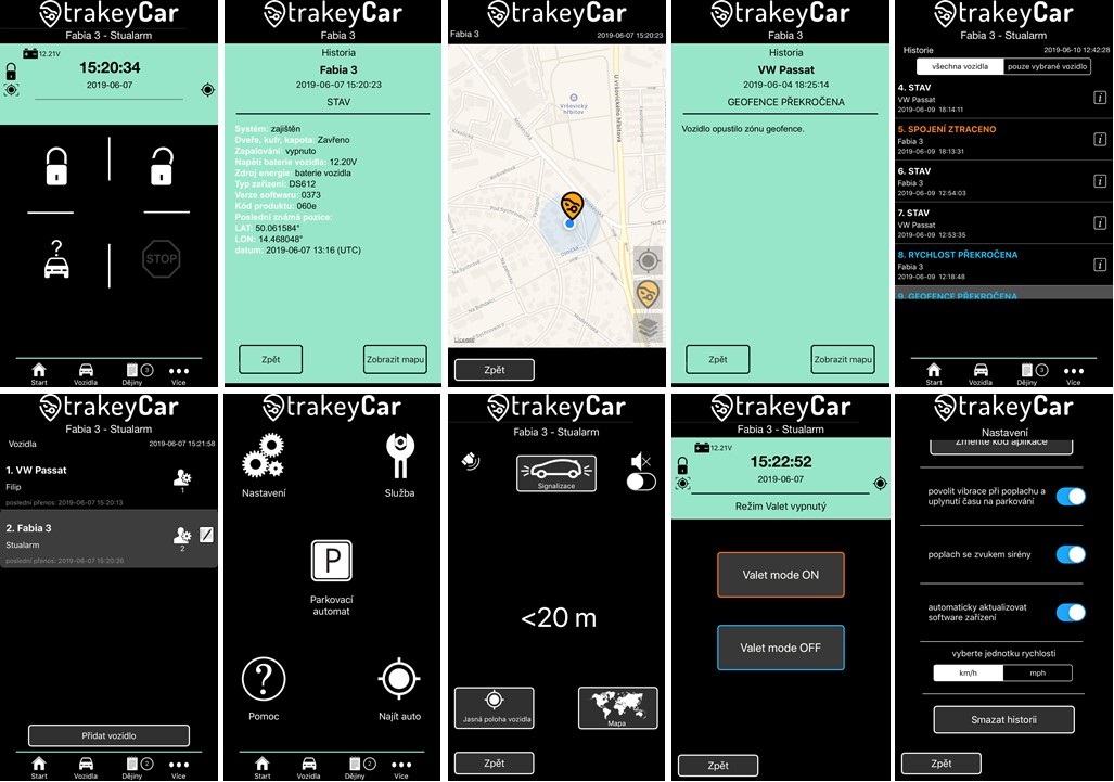 Oznámení v trakeyCar DS612 Nový způsob komunikace autoalarmu trakeyCar DS612 vyžaduje, aby shromážděná data byla nejprve odeslána na server a poté předána specializované aplikaci na smartphonu. Výhody jsou zřejmé: • server archivuje data až několik let zpět • získáte možnost zobrazit historii jízd, zastávek a shrnutí tras • zlepšuje komunikaci mezi aplikací ve vašem smartphonu a autoalarmem • umožňuje používat webový prohlížeč z libovolného počítače připojeného k internetu • více výstrah, jako je rychlost, opuštění zóny (geofence) • upozornění na ztrátu komunikace - v případě výpadku nebo zarušení sítě GPS/GSM budete informováni