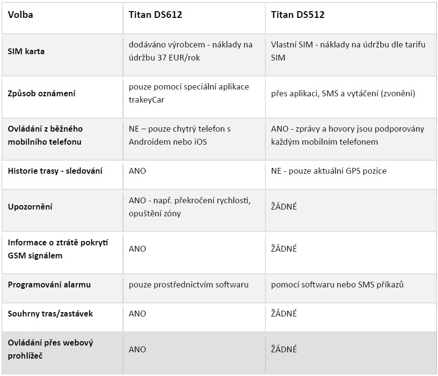 Porovnání DS612 s DS512 Pokud vás zajímá, zda si vybrat nový model DS612 nebo ověřený model DS512, následující přehled by Vám měl pomoci: SIM karta: poskytnutá výrobcem - náklady na údržbu 37 Euro / rok / vlastní náklady - náklady na provoz cca 50,- kč / měsíc oznámení: pouze pomocí vyhrazené aplikace / pomocí aplikace, SMS a vytáčení (vyzvánění) služby z běžného mobilního telefonu: NE - pouze chytrý telefon s operačním systémem Android nebo iOS / ANO - zprávy a hovory jsou zpracovávány mobilním telefonem historie trasy: sledování ANO - až 3 měsíce zpět / NE - pouze aktuální poloha GPS výstrahy: ANO - např. Překročení rychlosti, opuštění zóny / NE informace o ztrátě signálu GSM: ANO/ NE programování alarmu: pouze pomocí softwaru/ pomocí příkazů SMS nebo softwaru přehled tras / zastávek: ANO / NE připojení prostřednictvím webového prohlížeče: ANO / NE