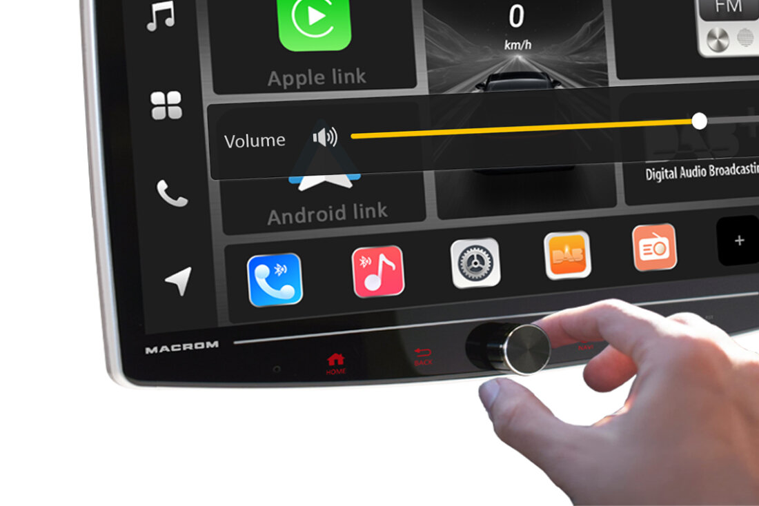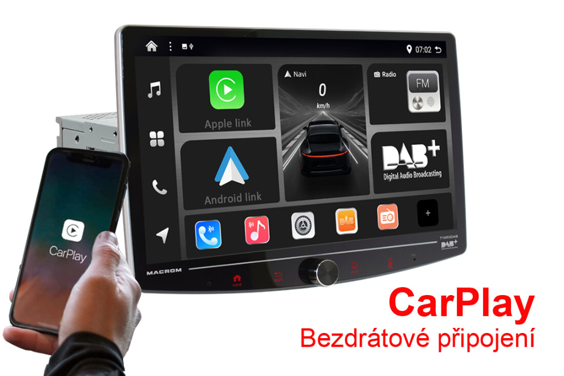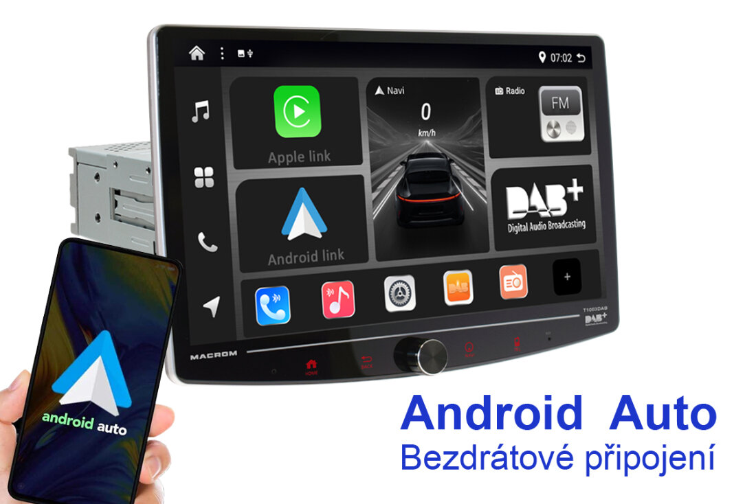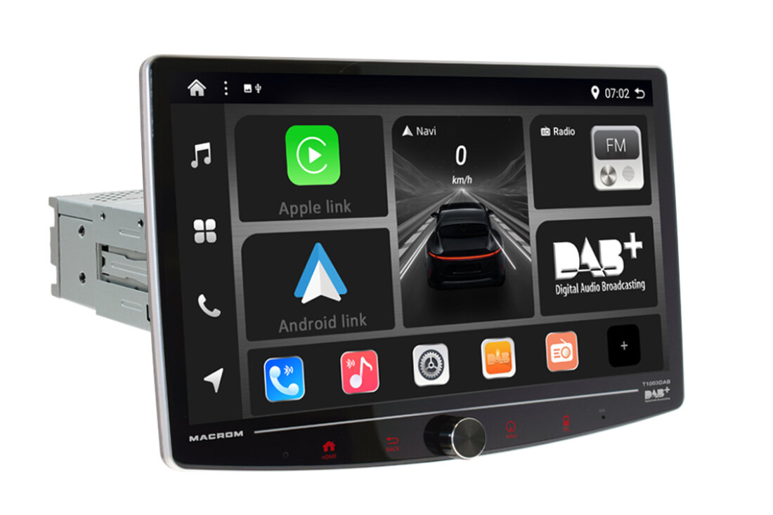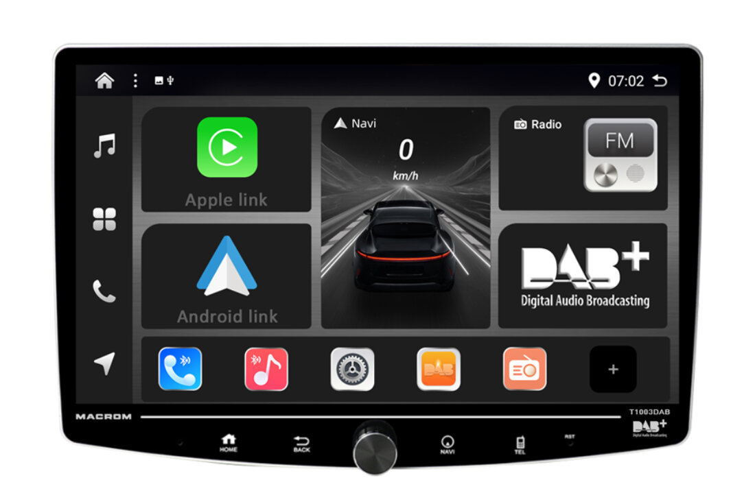 MACROM T1003DAB změní váš automobil na moderní infotainment centrum s multimediálním monitorem Elegantní 10" QLED kapacitní displej s možností natočení vám poskytne dokonale ostrý obraz, zatímco 8 jádrový procesor a Android 13 zajistí bleskovou odezvu.