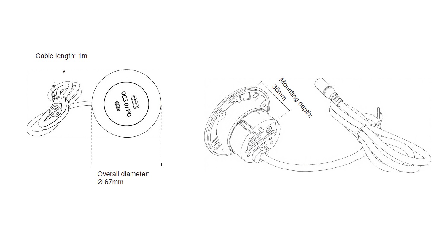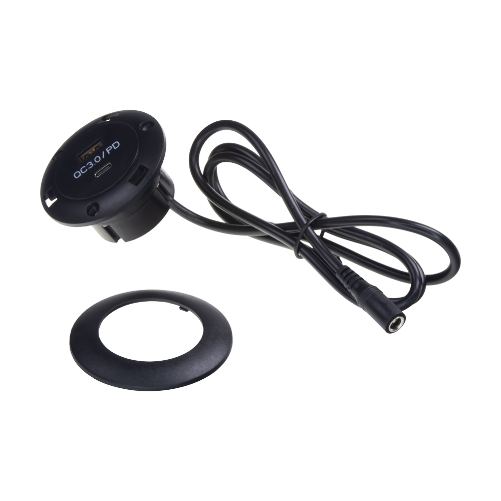 Technické parametry: • napájecí napětí: 12 V - 24 V • funkce rychlonabíjecí QC 3.0 (Qualcomm Quick Charge 3.0) • výstup USB: 5 V - 12V (5 V / 3 A, 9 V / 2 A, 12 V / 1.5 A max.) • výstup USB-C PD (power delivery) • ø montážního otvoru: 44 mm • rozměry: vnější ø68 mm, hloubka 34 mm, celková výška 40 mm • délka přívodního kabelu s DC konektorem: 100 cm • materiál: plast • hmotnost: 77g