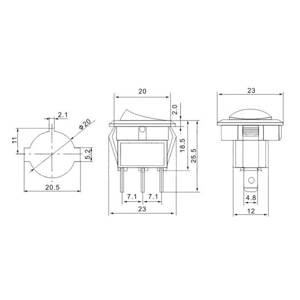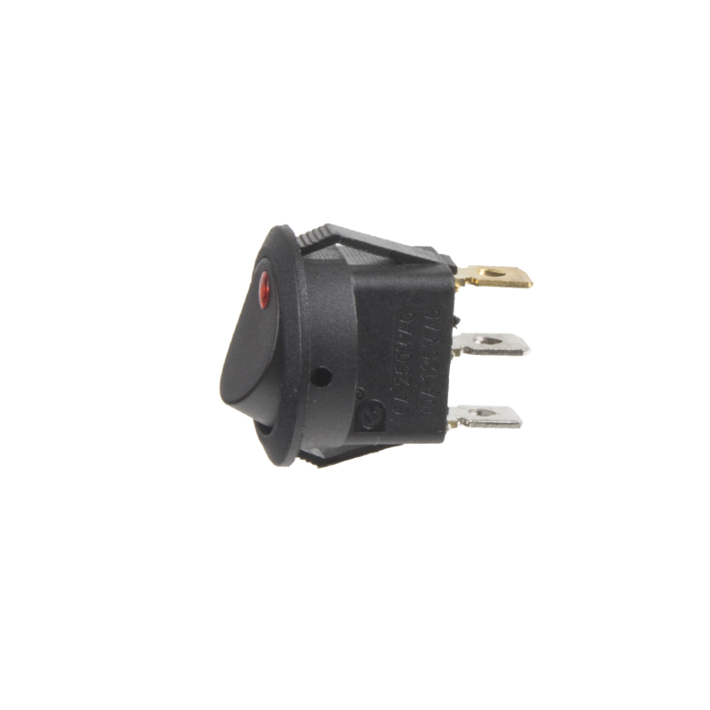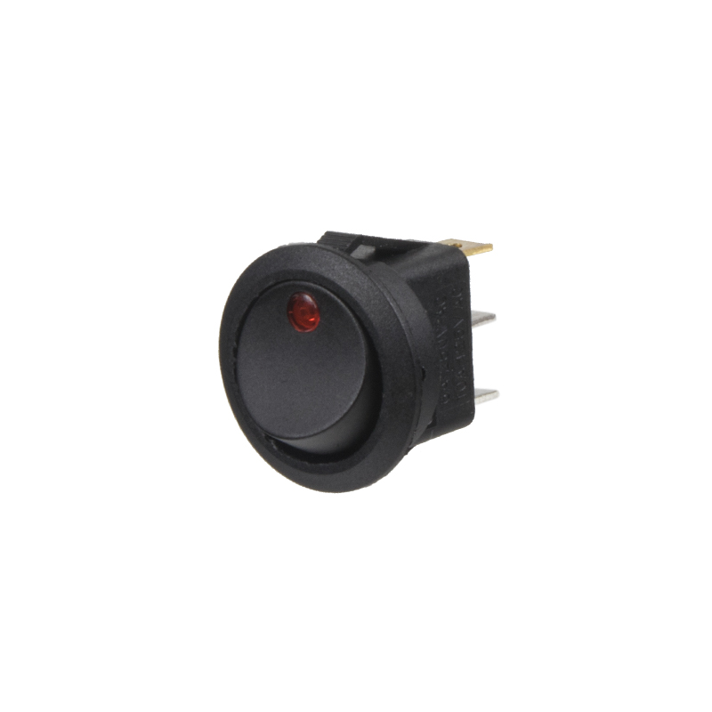 Spínač kolébkový kulatý 20 A červená LED kontrolka, průměr otvoru 20 mm, pro napájecí napětí 12 V. Spíná napětí mezi kontakty 1 a 2, kontakt 3 je - pól LED diody.