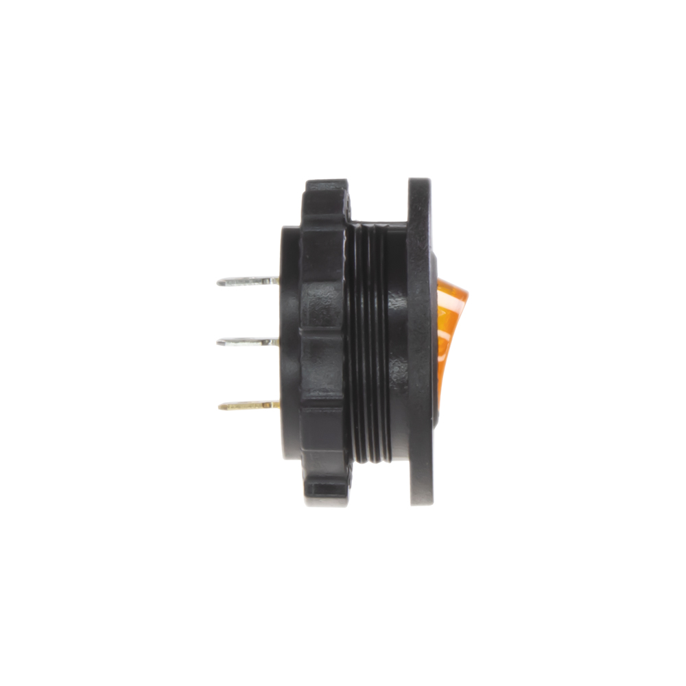 Spínač kolébkový kulatý 20A oranžový s podsvícením. Spíná kladné napětí mezi kontakty 1 a 2, na kontaktu 3 je kostra pro podsvícení.