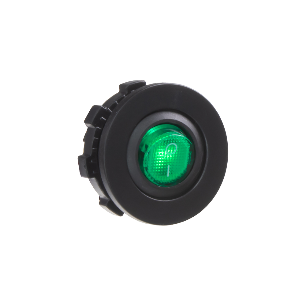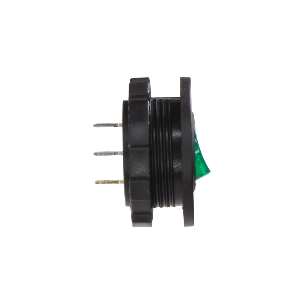 Spínač kolébkový kulatý 20A zelený s podsvícením. Spíná kladné napětí mezi kontakty 1 a 2, na kontaktu 3 je kostra pro podsvícení.