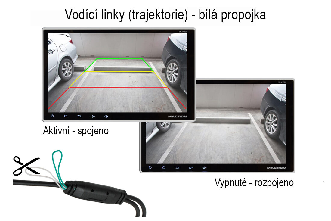 Kamera umožňuje zobrazení nebo skrytí trajektorií (vodících linek). Funkce je aktivní při spojené zelené smyčce v kabelovém svazku u kamery (výchozí nastavení - zobrazení vodících linek).