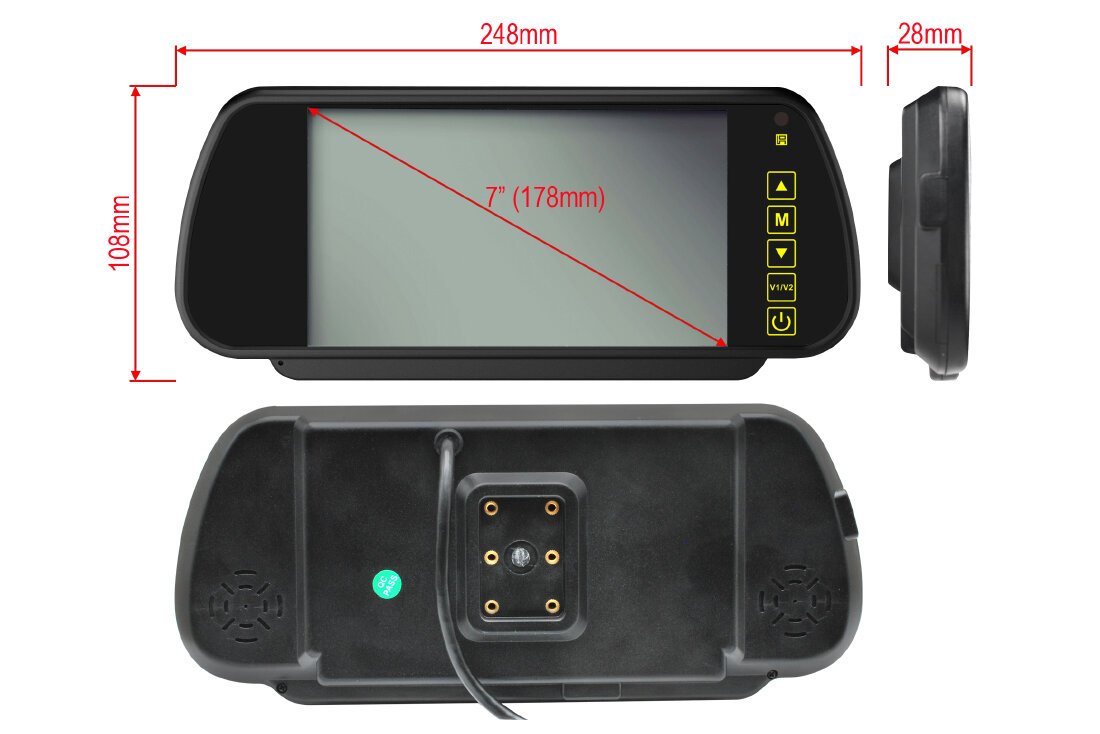 Monitor umístěný ve zpětném zrcátku slouží pro zobrazení obrazu z parkovací kamery nebo pro zobrazení obrazu DVD přehrávače. Zrcátko je umístěno na čelním skle na místě originálního zrcátka. Snadná instalace bez zásahu do interiéru automobilu - speciální držák vyberte ze souvisejících produktů podle typu automobilu a patky umístěné na čelním skle.