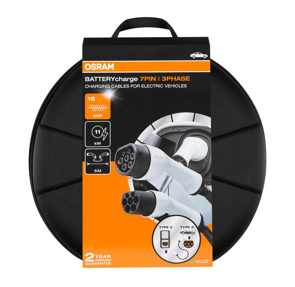 Vydejte se s OSRAM do budoucnosti bez emisí Objevte svět elektrického řízení s OSRAM. Nabíjejte své plně elektrické nebo plug-in hybridní vozidlo typu 2 na jakékoli nabíjecí stanici 16 A (1-fáze) vybavené zástrčkou typu 2. Nabíjecí kabel je vybaven ergonomickými držadly pro optimální manipulaci a má délku kabelu 5 metrů. Je vhodný pro použití na veřejných dobíjecích stanicích i doma. Nabíjecí kabely jsou navíc vybaveny protiprachovými krytkami a testovány na vodotěsnost podle IP65 a odolnost proti nárazu podle IK10. I po připojení jsou elektrická kontaktní místa chráněna proti vnikání prachu a stříkající vody v souladu s IP65 a IK10. Součástí dodávky je také odolný, kompaktní úložný vak pro přehledné uložení kabelu po nabití. Kromě toho je výrobek certifikován TÜV a CE a je dodáván s 2 letou zárukou.