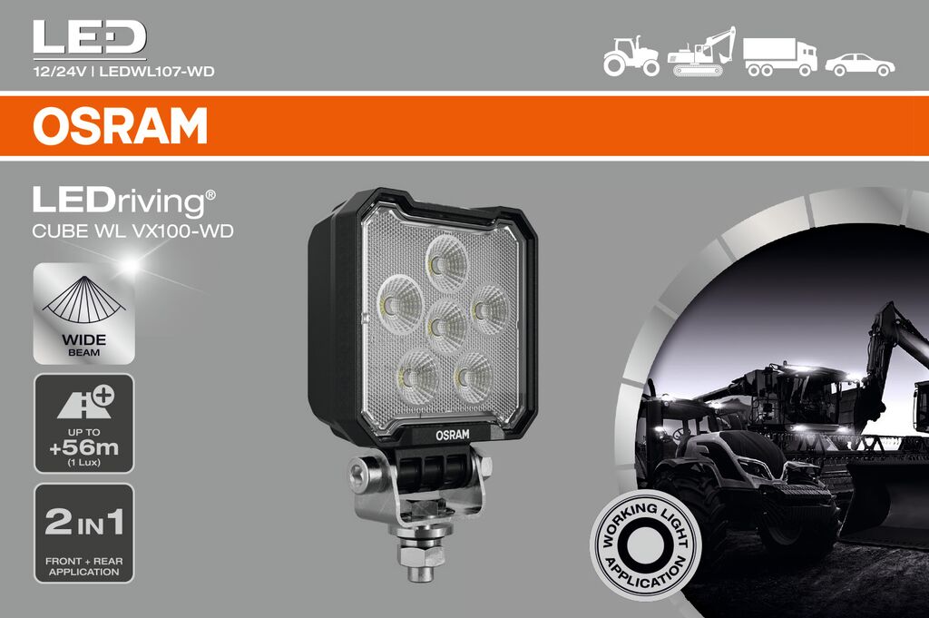 Výkonná pracovní světla LED Se světlem OSRAM LEDriving Cube WL VX100-WD dosáhnete působivého osvětlení na tmavých polních a lesních cestách, v terénu i mimo vyšlapané cesty. Pracovní světlo kombinuje cenovou dostupnost s výjimečným výkonem, kvalitou a funkčností a poskytuje uživatelům působivou viditelnost na pracovištích mimo silnice a terénní oblasti. Pracovní světlo je navrženo tak, aby vyhovovalo různorodým úkolům, a zaujme světelným tokem až 2000 lm a širokým paprskem s širokým rozložením světla, což výrazně zvyšuje bezpečnost při práci pro vás i ostatní. I za špatného světla a snížené viditelnosti dokáže pracovní světlo s hodnotou až 6000 Kelvinů zajistit podmínky podobné dennímu světlu. Je všestranně použitelné, odolává četným vlivům prostředí a díky vysoce kvalitním materiálům, jako je hliníkový kryt a stabilní polykarbonátová čočka, je mimořádně lehké a zároveň robustní a odolné. Pracovní světlo má navíc schválení podle normy ECE R148 jako světlo pro couvání. Světlo LEDriving Cube WL VX100-WD bylo testováno a ověřeno s třídou krytí IP6K8 a IP6K9K v naší laboratoři pro simulaci prostředí s certifikací DIN pro extrémní vnější vlivy týkající se vody, prachu, nárazů, tepla, chladu a trvalých vibrací. Je efektivním a účinným doplňkem vašeho vozidla a lze jej připevnit na nákladní vozidla, zemědělské stroje, užitková vozidla, stavební vozidla a terénní vozidla. Společnost OSRAM na něj poskytuje dvouletou záruku (1).