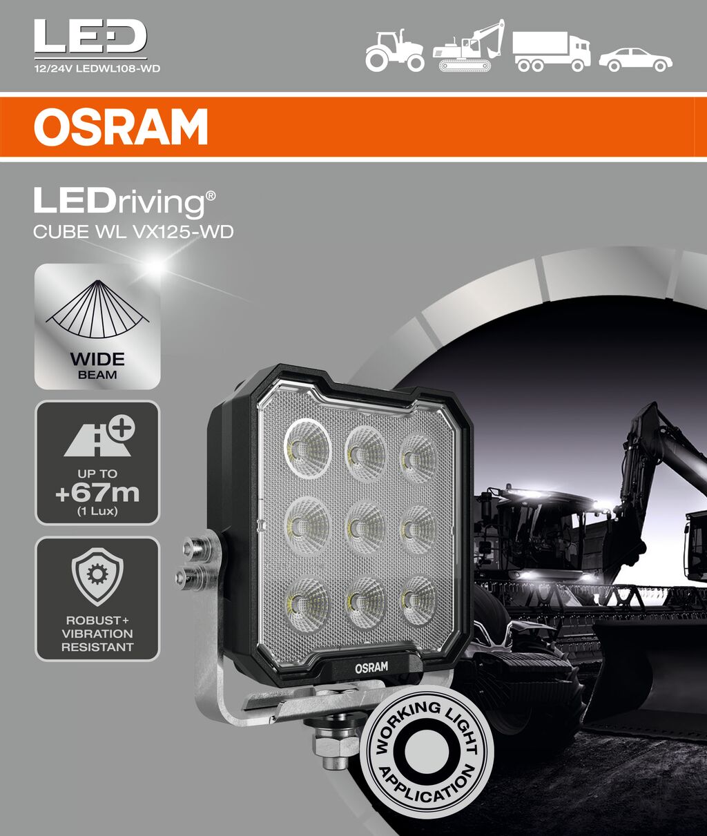 Výkonná pracovní světla LED Se světlem OSRAM LEDriving Cube WL VX125-WD dosáhnete působivého osvětlení na tmavých polních a lesních cestách, v terénu i mimo vyšlapané cesty. Pracovní světlo kombinuje cenovou dostupnost s výjimečným výkonem, kvalitou a funkčností a poskytuje uživatelům působivou viditelnost na pracovištích mimo silnice a terénní oblasti. Pracovní světlo je navrženo tak, aby vyhovovalo různorodým úkolům, a zaujme světelným tokem až 3 000 lm a širokým paprskem s širokým rozložením světla, což výrazně zvyšuje bezpečnost při práci pro vás i ostatní. I za špatného světla a snížené viditelnosti dokáže pracovní světlo s hodnotou až 6000 Kelvinů zajistit podmínky podobné dennímu světlu. Je všestranně použitelné, odolává četným vlivům prostředí a díky vysoce kvalitním materiálům, jako je hliníkový kryt a stabilní polykarbonátová čočka, je mimořádně lehké a zároveň robustní a odolné. LEDriving Cube WL VX125-WD byl testován a ověřen s třídou krytí IP6K8 a IP6K9K v naší certifikované laboratoři pro simulaci prostředí podle normy DIN na extrémní vnější vlivy týkající se vody, prachu, nárazů, tepla, chladu a trvalých vibrací. Je efektivním a účinným doplňkem vašeho vozidla a lze jej připojit k nákladním automobilům, zemědělským strojům, užitkovým vozidlům, stavebním vozidlům a terénním vozidlům (1). Společnost OSRAM na něj poskytuje dvouletou záruku (2).