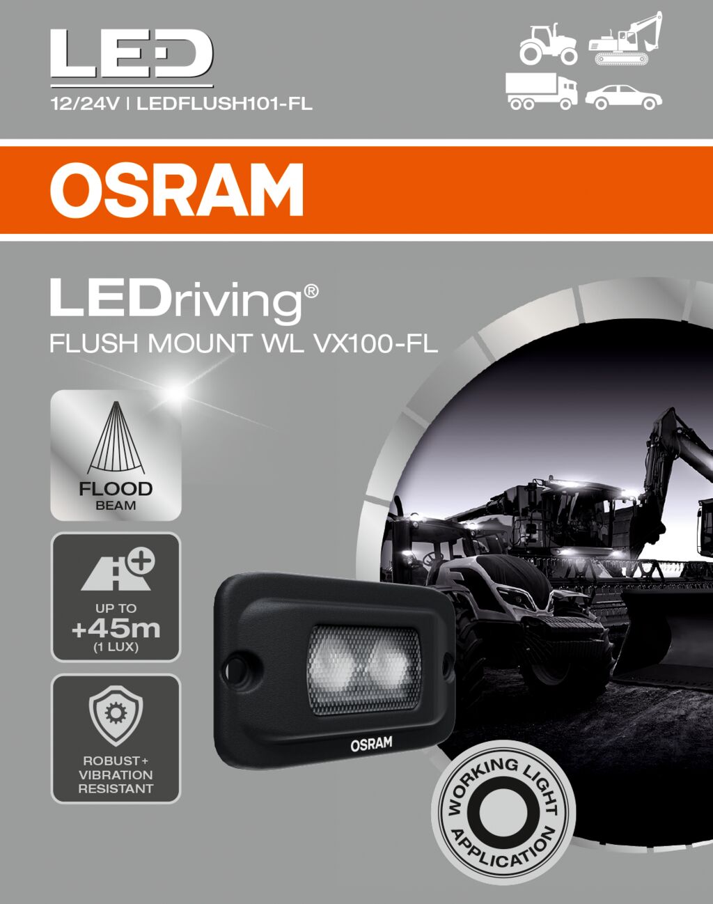 Výkonná pracovní světla LED Objevte všestrannost montáže OSRAM LEDriving WL VX100-FL pro výkonné osvětlení blízkého a vzdáleného okolí v přední, zadní nebo boční části vašeho vozidla. Pracovní světlo kombinuje cenovou dostupnost s výjimečným výkonem, kvalitou a funkčností. Se světelným tokem až 600 lm s širokým kuželem světla je pracovní světlo ideální pro osvětlení blízkých i vzdálených oblastí. Díky konstrukce a elegantnímu tvaru se pracovní světlo plynule integruje do designu vozidla a nabízí lepší viditelnost bez kompromisů ve stylu. Se světelným paprskem dosahujícím až 45 metrů a barvou světla 6500 Kelvinů zajišťuje jasnou viditelnost i v nepříznivých podmínkách. Pracovní světlo je kompatibilní s 12 V i 24 V elektrickými systémy, takže je vhodné pro širokou škálu vozidel včetně nákladních automobilů, zemědělských strojů, stavebních vozidel, karavanů, čtyřkolek a terénních vozidel (1). Ať už jde o náročná pracovní prostředí, kempování nebo dobrodružství v terénu, LED světlo nabízí všestranná řešení osvětlení přizpůsobená různým jízdním scénářům. Světlomet LEDriving Flush Mount WL VX100-FL je vybaven nerozbitnou polykarbonátovou čočkou a hliníkovým tlakově litým pouzdrem, je robustní a odolný proti vibracím, aby odolal nejdrsnějším podmínkám. Byl testován a ověřen s nejvyššími třídami ochrany IP IP6K8 a IP6K9K v naší laboratoři pro simulaci prostředí s certifikací DIN pro extrémní vnější vlivy týkající se vody, prachu, nárazů, tepla, chladu a trvalých vibrací. OSRAM navíc poskytuje na produkt 2letou záruku (2).