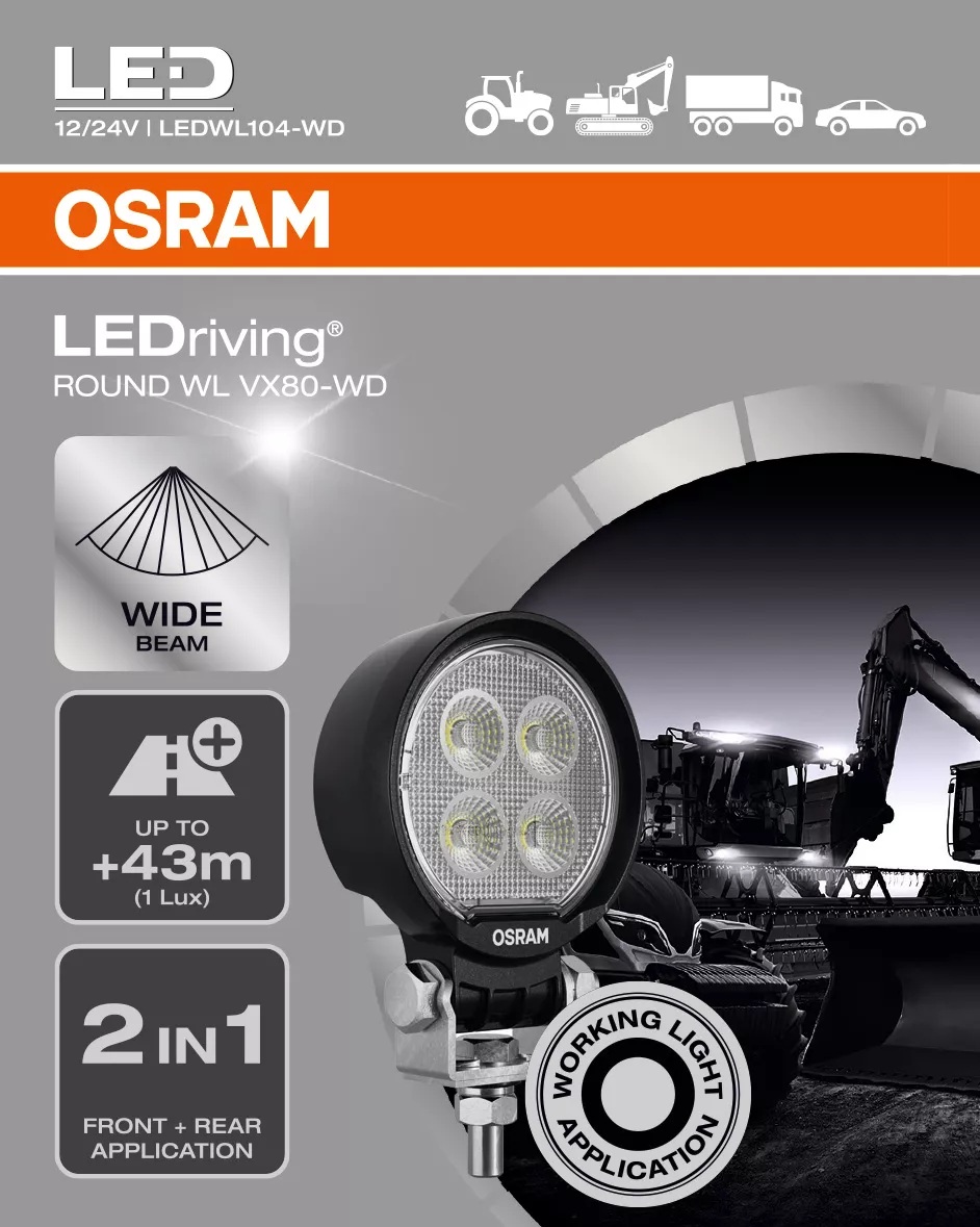 Výkonná pracovní světla LED S OSRAM LEDriving Round WL VX80-WD dosáhnete působivého osvětlení na tmavých polních a lesních cestách, v terénu i mimo vyšlapané cesty. Pracovní světlo kombinuje cenovou dostupnost s výjimečným výkonem, kvalitou a funkčností a poskytuje uživatelům působivou viditelnost na pracovištích mimo silnice a terénní oblasti. Pracovní světlo je navrženo tak, aby vyhovovalo různorodým úkolům, a zaujme světelným tokem až 1350 lm a širokým paprskem s širokým rozložením světla, což výrazně zvyšuje bezpečnost při práci pro vás i ostatní. I za špatného světla a snížené viditelnosti dokáže pracovní světlo s hodnotou až 6000 Kelvinů zajistit podmínky podobné dennímu světlu. Je všestranně použitelné, odolává četným vlivům prostředí a díky vysoce kvalitním materiálům, jako je hliníkový kryt a stabilní polykarbonátová čočka, je mimořádně lehké a zároveň robustní a odolné. Pracovní světlo má navíc schválení podle normy ECE R148 jako světlo pro couvání. Světlo LEDriving Round WL VX80-WD bylo testováno a ověřeno s třídou krytí IP6K8 a IP6K9K v naší laboratoři pro simulaci prostředí s certifikací DIN pro extrémní vnější vlivy týkající se vody, prachu, nárazů, tepla, chladu a trvalých vibrací. Je efektivním a účinným doplňkem vašeho vozidla a lze jej připojit k nákladním automobilům, zemědělským strojům, užitkovým vozidlům, stavebním vozidlům a terénním vozidlům (1). Společnost OSRAM na něj poskytuje dvouletou záruku (2).