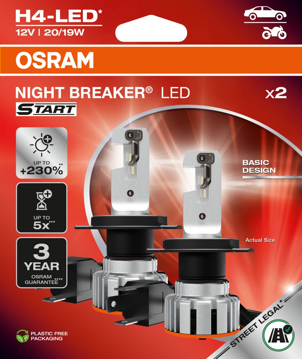 Vydejte se do světa legálních (1) náhradních LED žárovek s OSRAM NIGHT BREAKER LED START. NIGHT BREAKER LED START se zaměřuje na základní vlastnosti a výhody legálních (1) náhradních žárovek LED. Větší viditelnost (3) a tím i vyšší jízdní komfort, šetrnost k životnímu prostředí a úspora nákladů díky menšímu počtu výměnných cyklů a modernějšímu vzhledu. Cenově dostupné produkty pro vstup do světa legálních (1) LED, aniž byste museli slevit z klíčových výhod. S LED OSRAM street-legal (1) můžete těžit z vysoce energeticky účinného, jasného a moderního LED světla. Nyní můžete upgradovat funkci vašich dálkových a potkávacích světel na nejmodernější technologii LED. Tyto náhradní LED žárovky jsou vhodné jako náhrada běžných halogenových žárovek. Nabízejí moderní a jasné bílé světlo s barevnou teplotou až 6000 Kelvinů a zapůsobí až o 230% vyšším jasem (2), zatímco oslnění ostatních účastníků silničního provozu klesne pod přípustné maximální hodnoty až o 50% (2). Ve srovnání se standardními halogenovými žárovkami spotřebují tyto LED až o 60% méně energie a přesvědčí díky technologii LED a speciálně vyvinutému designu odolnému proti vibracím s až 5x delší životností (3). Nyní můžete vyměnit žárovky svého vozidla za revoluční retrofit žárovky OSRAM NIGHT BREAKER LED (1) OSRAM navíc nabízí vyhrazenou záruku na všechny retrofitové žárovky NIGHT BREAKER LED (4).