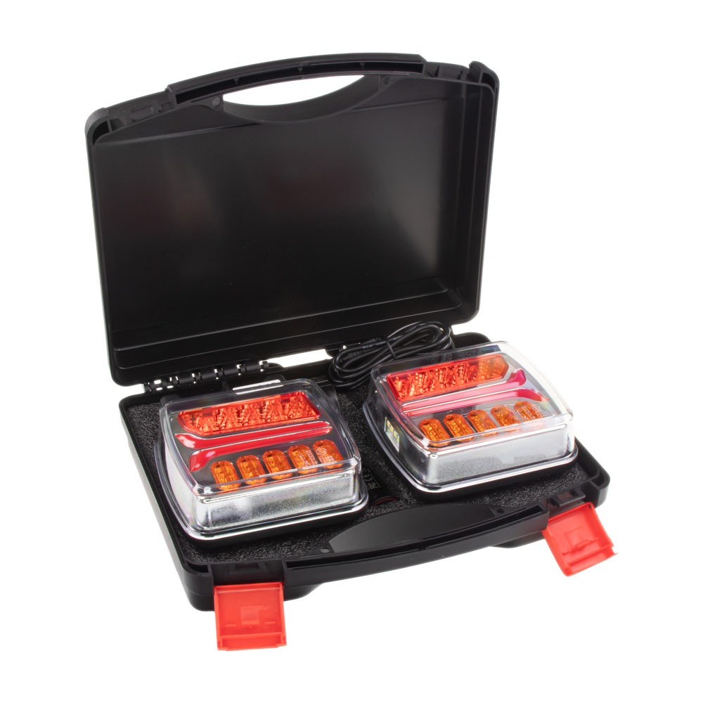 2x sdružená aku lampa zadní LED s bezdrátovým připojením k 7 pin zástrčce. Určeno např. pro označení nadměrného nákladu, přívěsného vozíku nebo jízdních kol upevněných na nosiči nebo 5 dveřích. Práce se setem je příjemnější, jelikož světla mají vnitřní akumulátor (bez nutnosti natahovat kabeláž) a jsou bezdrátově ovládány z vysílače umístněného v 7 PIN zásuvce.