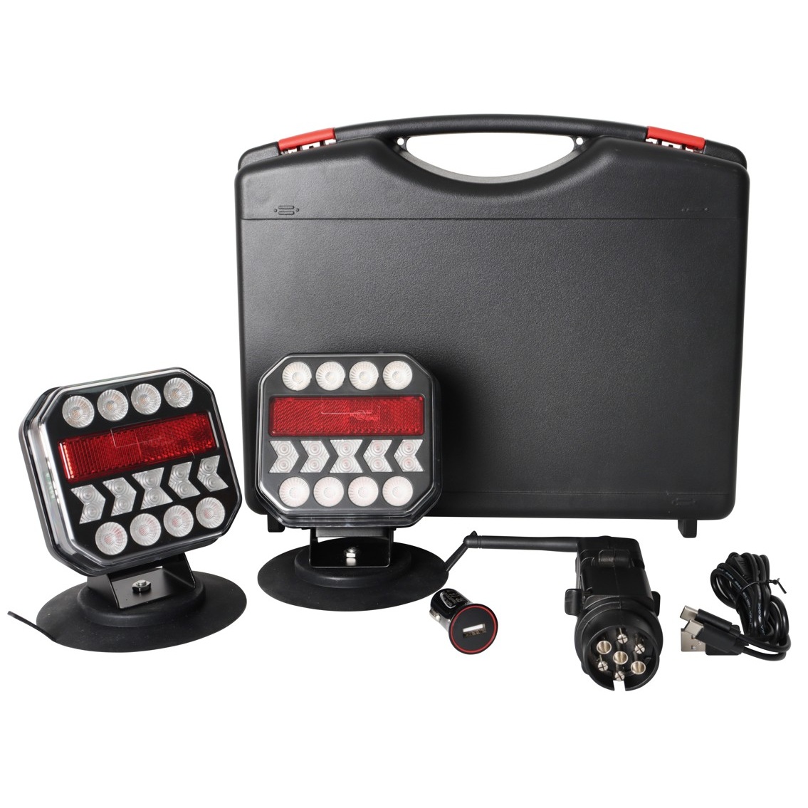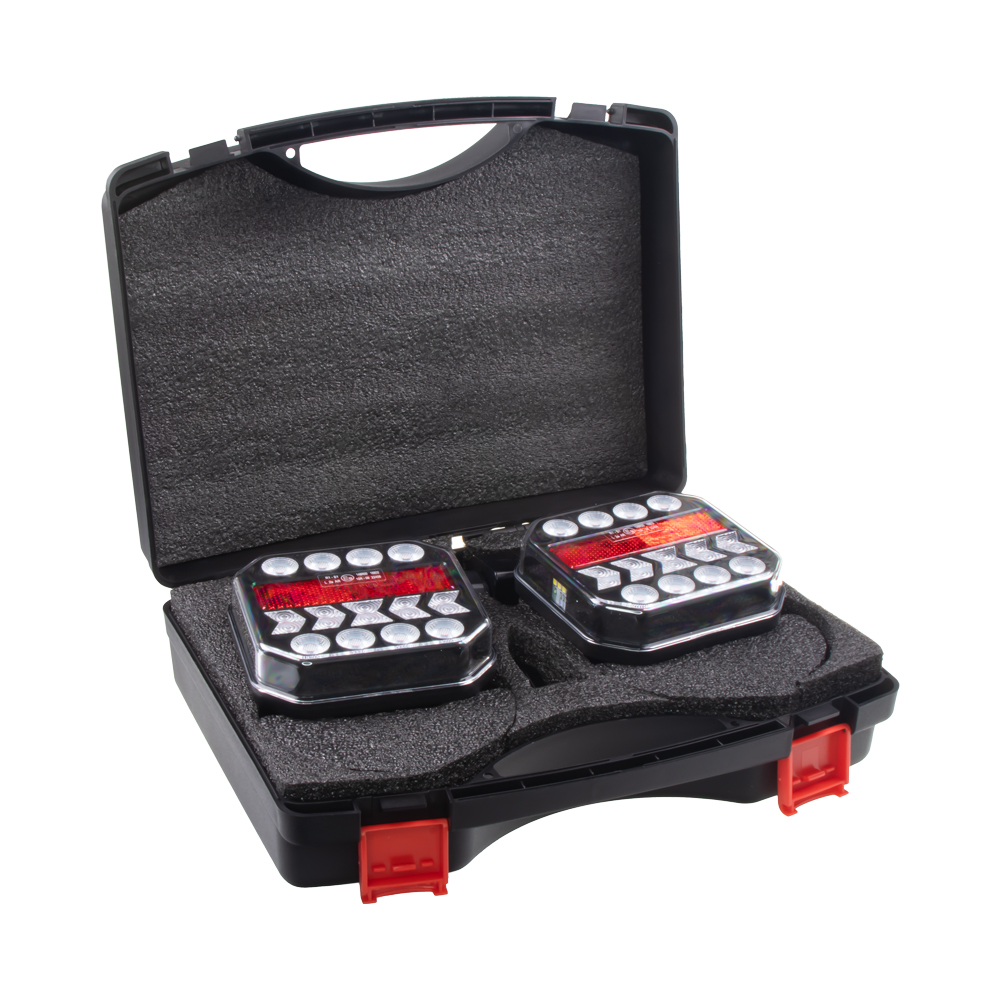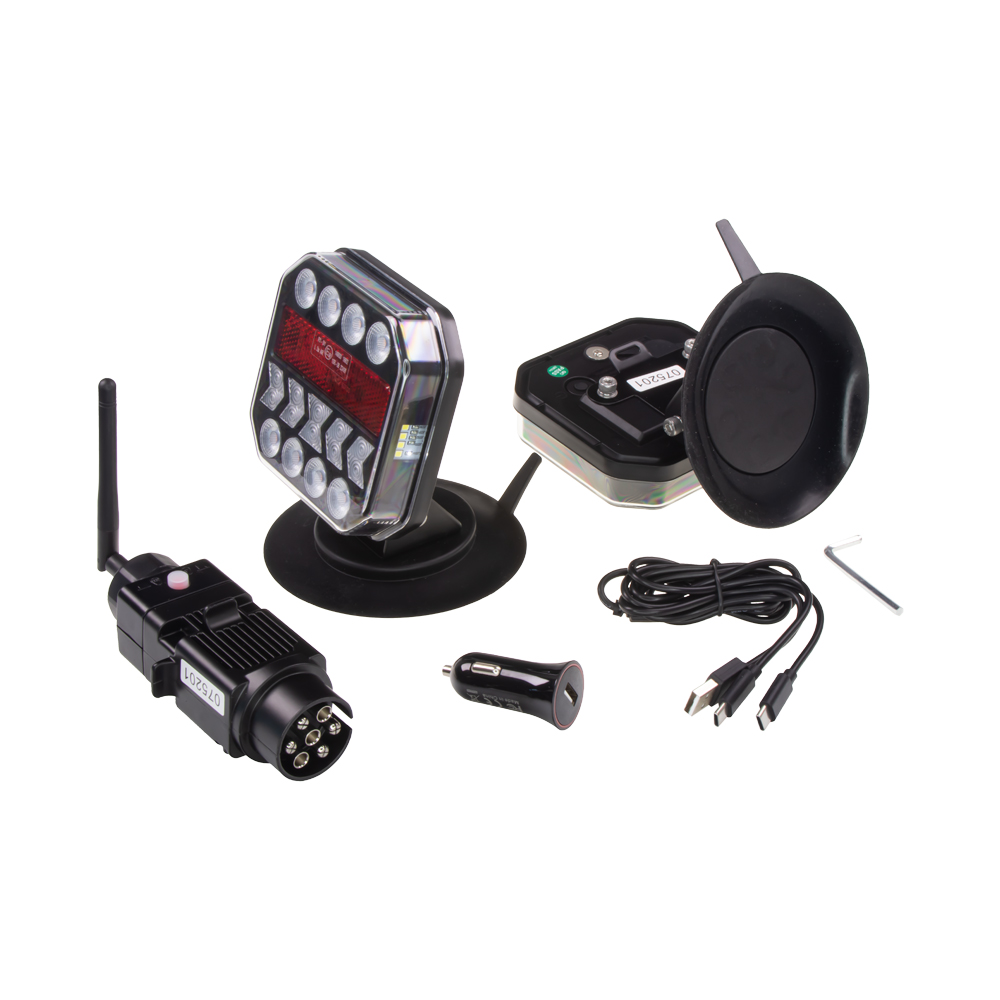 2x sdružená aku lampa zadní LED s bezdrátovým připojením k 7 pin zástrčce. Určeno např. pro označení nadměrného nákladu, přívěsného vozíku nebo jízdních kol upevněných na nosiči nebo 5 dveřích. Práce se setem je příjemnější, jelikož světla mají vnitřní akumulátor (bez nutnosti natahovat kabeláž) a jsou bezdrátově ovládány z vysílače umístněného v 7 PIN zásuvce.
