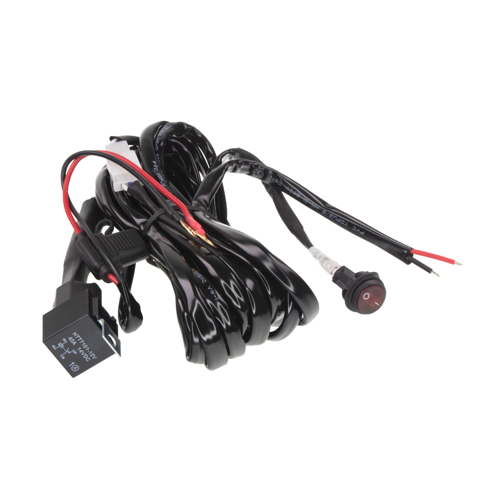 Kabelová sada pro pracovní světla a rampy, včetně voděodolného spínače, pojistky a relé. Sada zakončena volnými vodiči pro připojení světla.