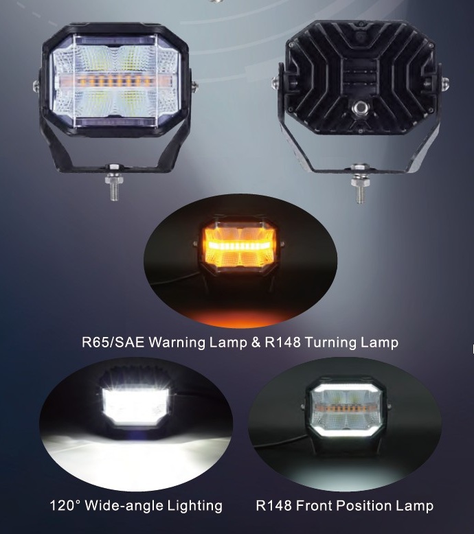 Technické parametry: • rozptýlený paprsek světla: 120° • barva světla: bílé světlo 6000 K • oranžové světlo: bliká (9 různých režimů) • včetně funkce pozičního světla a dynamického směrového světla • velmi odolný teplovodivý hliníkový obal v černé barvě • výkon LED: 80 W • napájecí napětí: 12 V - 24 V • proudový odběr: 5,5 A / 12 V - 2,6 A / 24 V (bílá) • odolnost proti nárazu, vodotěsné: IP69K • uchycení pomocí nerezového držáku • vnější rozměry: 150 mm x 115 mm x 98,5 mm • homologace: ECE R65, ECE R148 (poziční světlo), ECE R10 • v balení je 1 ks světla