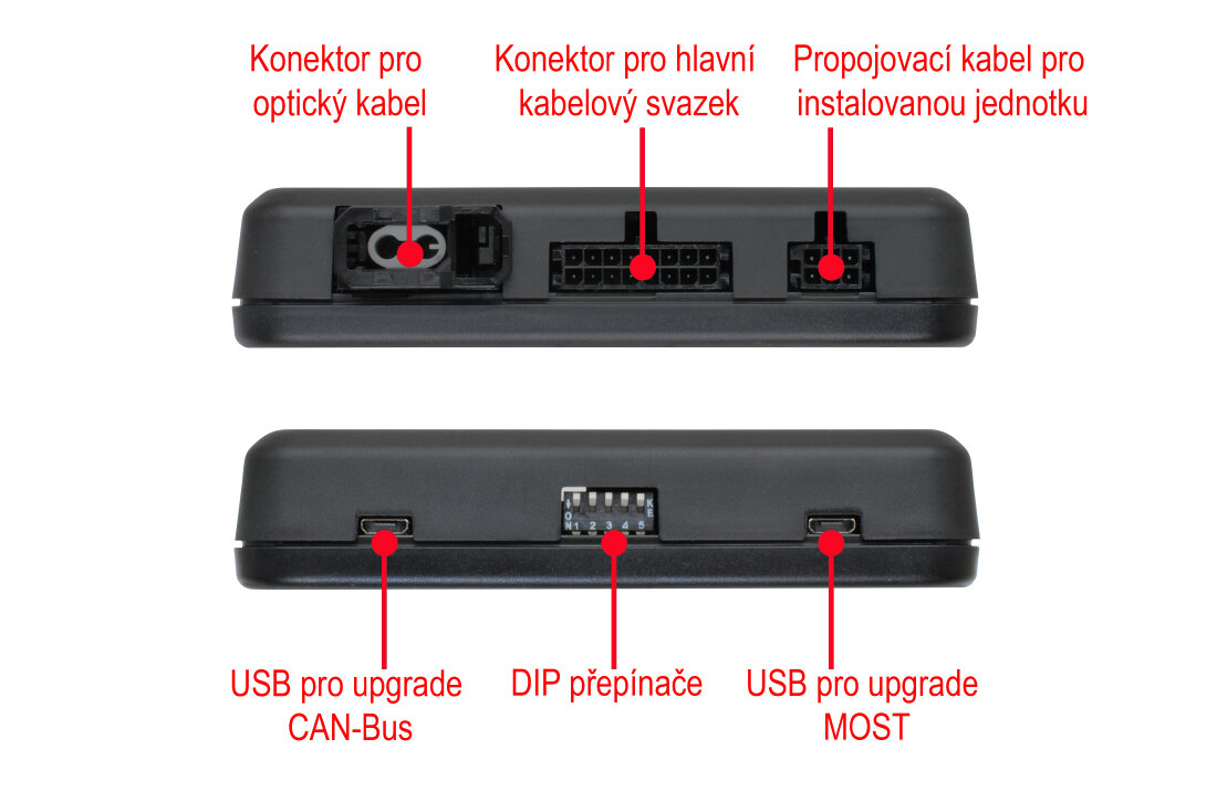 Automobily s OEM jednotkou PCM3.1 připojenou FAKRA konektorem a OEM aktivním audio systémem připojeným optickým kabelem MOST25.