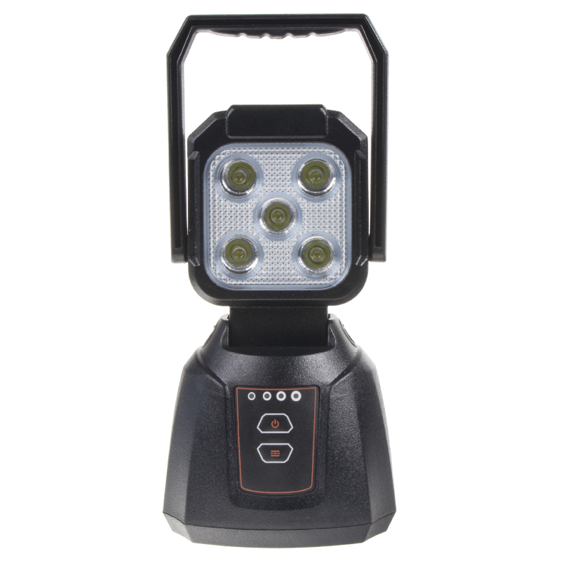 Technické parametry • rozptýlený paprsek světla (cca 60º) resp. ve vzdálenosti 40 m šíře osvětlení cca 40m • barva světla bílá / oranžová • velmi odolný hliníkový obal v černé barvě • 4 režimy svícení: plný svit/ poloviční svit/ signál S.O.S./ rychlé blikání - oranžová barva • 5x LED modul 3 W Bridgelux • vestavěný nabíjecí lithiový akumulátor 7,4V 4400 mAh • doba nabíjení 4 - 5 h • ukazatel stavu nabití baterie • doba svícení cca 4,5 h při plném svitu / 9 h při polovičním svitu • napájecí adaptér na 230 V i 12 V • odolnost proti nárazu, voděodolné IP65 • svítivost 950 LM plný svit / 475 LM poloviční svit • základna s magnetem • rozměry: 200 x 110 x 95 mm v balení je 1 ks světla