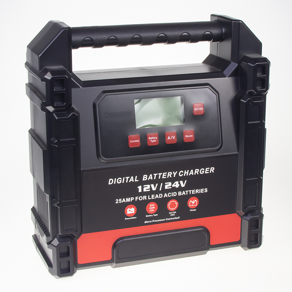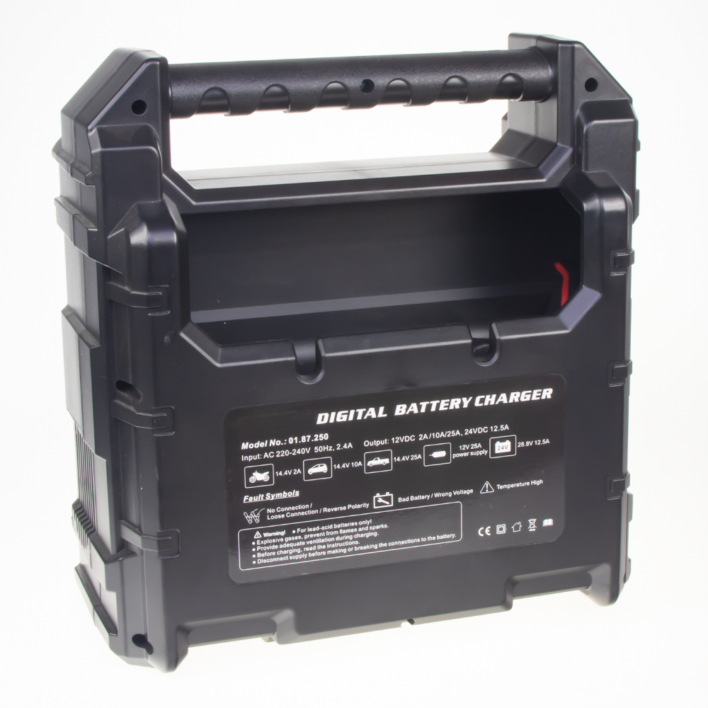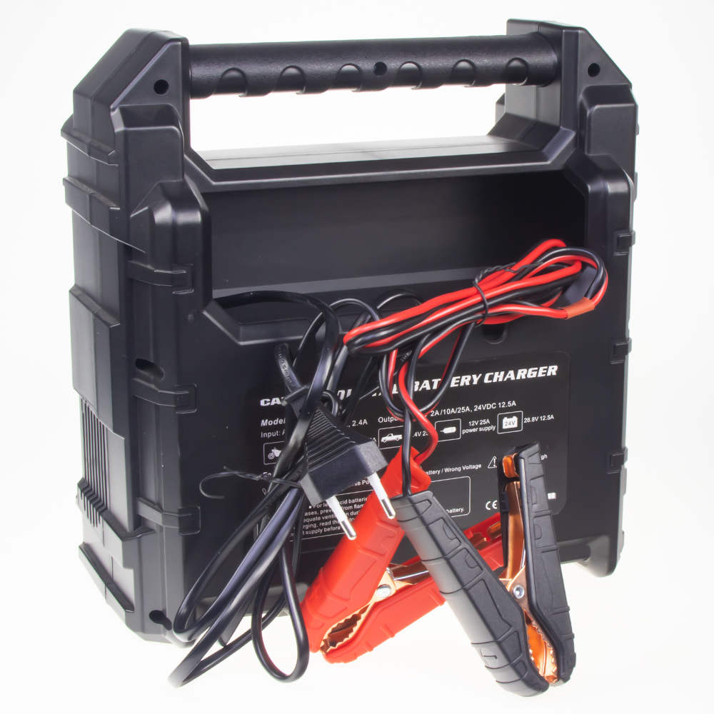 Technické parametry - technologie vysokofrekvenčního spínaného zdroje - 9-úrovňové nabíjení/udržovací nabíjení - indikace zvoleného režimu a průběh nabíjení pomocí přehledného informačního displeje (Napětí, Ampéry. Stav) - určeno pro olověné baterie 12 / 24 V (WET, AGM, GEL, VRLA, CALCIUM) - nabíjecí napětí: STD 14,4 / 14,7 V, CAL 15,9 V & STD 28,8 / 29,4 V, CAL 30,5 V - nabíjecí proud: pro 12V - 25 A / 12 A / 5 A , pro 24V - 12,5 A - doporučená kapacita baterií: pro 12 V 12–500 Ah, pro 24V 6 - 250 Ah - délka přívodního kabelu: 1,5 m - délka kabelu ke svorkám: 1 m - hmotnost 1600 g - rozměry: 250 x 260 x 120 mm - AC 220–240 V (2,4 A max)