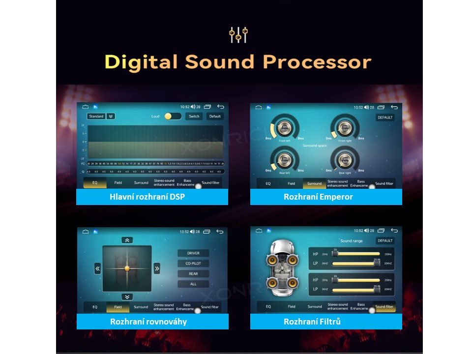 Vlastnosti: rádio s RDS, AM: 522 KHz - 1620 KHz; FM: 87,5 MHz - 108,0 MHz možnost připojení externího tuneru pro příjem digitálního rádia DAB+ - Radio Data SystemBluetooth fungující jako handsfree / přehrávač Wi-Fi přijímač a internetové aplikace 4G připojení Mirror link, CarPlay + Android Auto bezdrátový operační systém Android v českém jazyce UIS8581 Octa-Core, 8 x 1,6GHz Cortex A55, operační paměť: 4GB (RAM), vestavěná paměť: 64GB (pro správu souborů) přehrávání videa s vysokým rozlišením 1080P zobrazení: otevření dveří vozu, nastavení klima / topení, OEM parkovacího systému (pokud je podporováno) Technické parametry: Mechanika CD mechanika: NE DVD mechanika: NE přehrávané formáty: MP5 / WMA / JPEG / MP4 / MP3 atd.